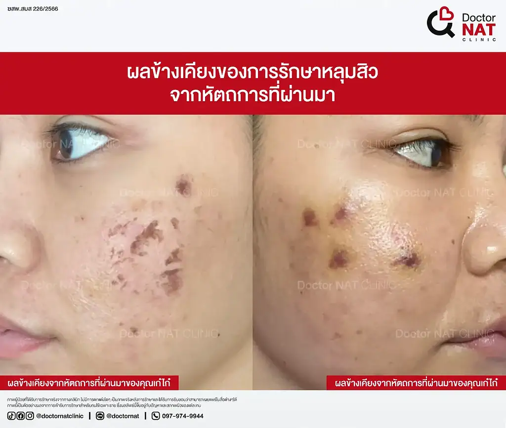 คุณรุ้ง พนักงานออฟฟิศจากสมุทรปราการ มีปัญหาหลุมสิวบริเวณแก้มและขมับยาวนานกว่า 10 ปี เคยรักษามาหลายวิธีทั้ง E-Matrix, Subcision, PRP และ Derma Pen รวมหลายสิบครั้ง ใช้งบไปหลักแสน แต่ได้ผลเพียงเล็กน้อย แถมต้องเผชิญกับอาการเจ็บ ช้ำ และสิวอักเสบตามมา จนมารักษาด้วยโปรแกรม MASS Surgery ที่ Doctor NAT Clinic หลุมสิวของคุณรุ้งดีขึ้นชัดเจน 60–70% มากกว่าการรักษาที่เคยทำมาทั้งหมด