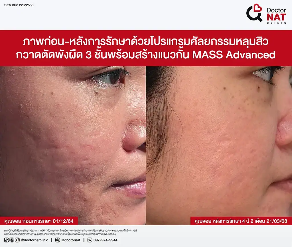 คุณพลอย พนักงานออฟฟิศในกรุงเทพ มีปัญหาหลุมสิวที่แก้มยาวนานกว่า 10 ปี เคยรักษามาหลายวิธีทั้ง Subcision, PRP, Pico Discovery รวมหลายรอบ แต่ผลลัพธ์ดีขึ้นเพียงชั่วคราว จนมารักษาด้วยโปรแกรม MASS Surgery ที่ Doctor NAT Clinic เพียง 1 ครั้ง คุณพลอยบอกว่าหลุมสิวค่อย ๆ ฟูขึ้นเรื่อย ๆ ดีขึ้นแล้วประมาณ 20–30% และยังมีแนวโน้มดีขึ้นต่อเนื่อง