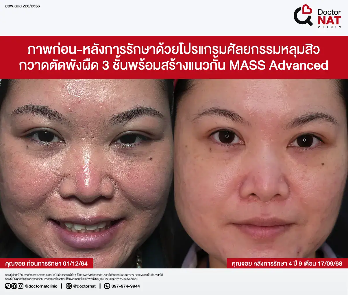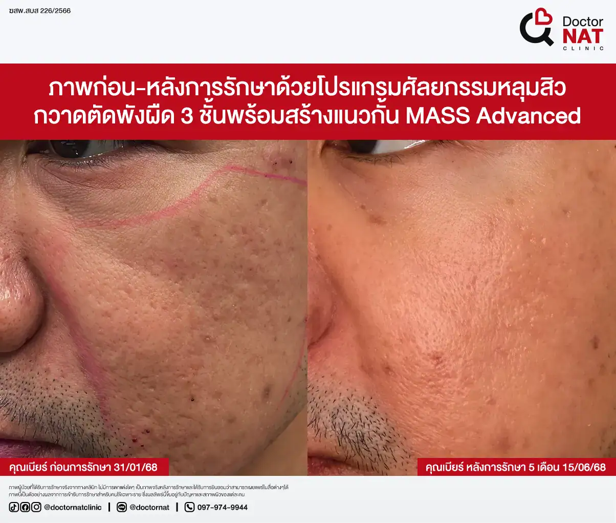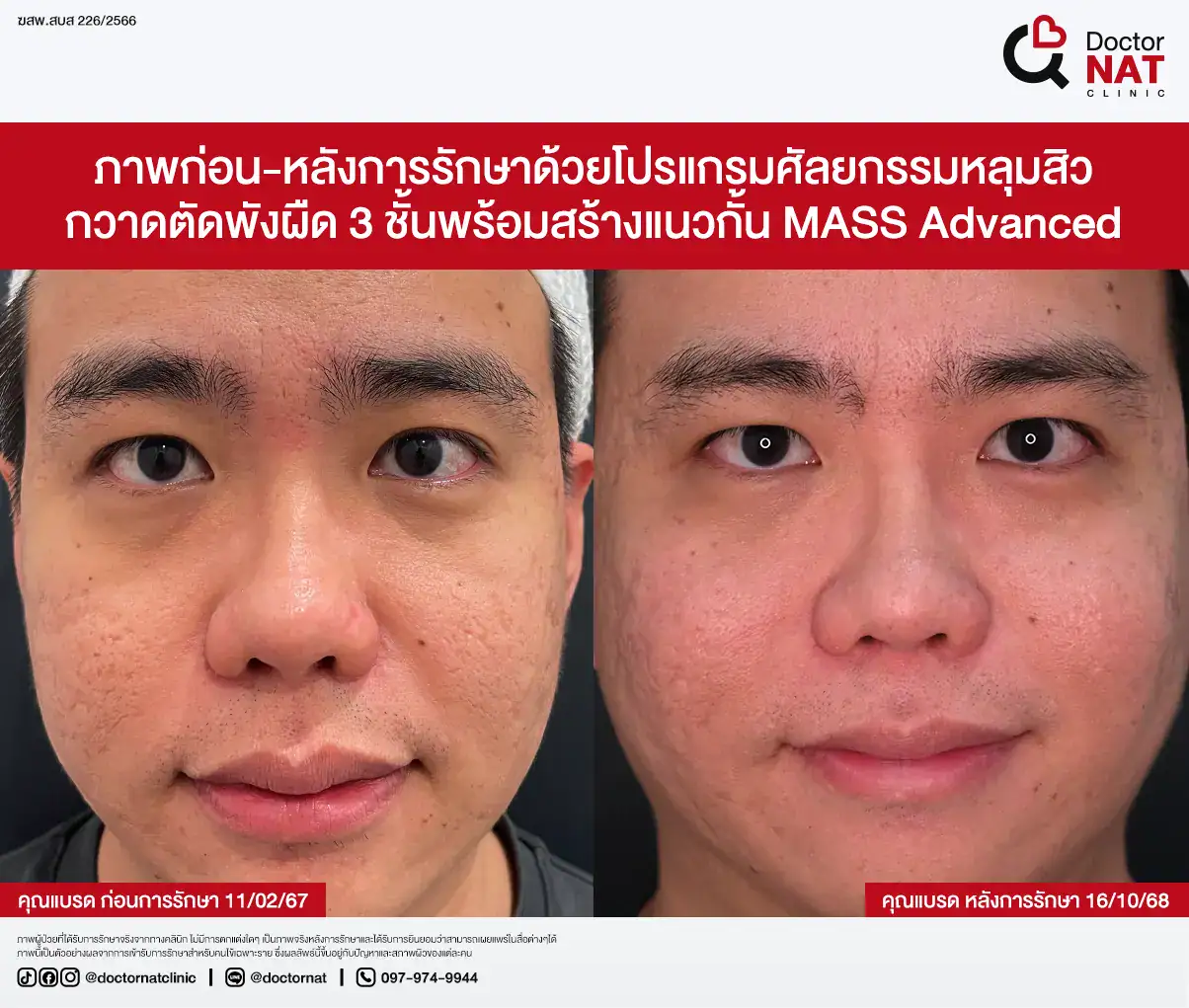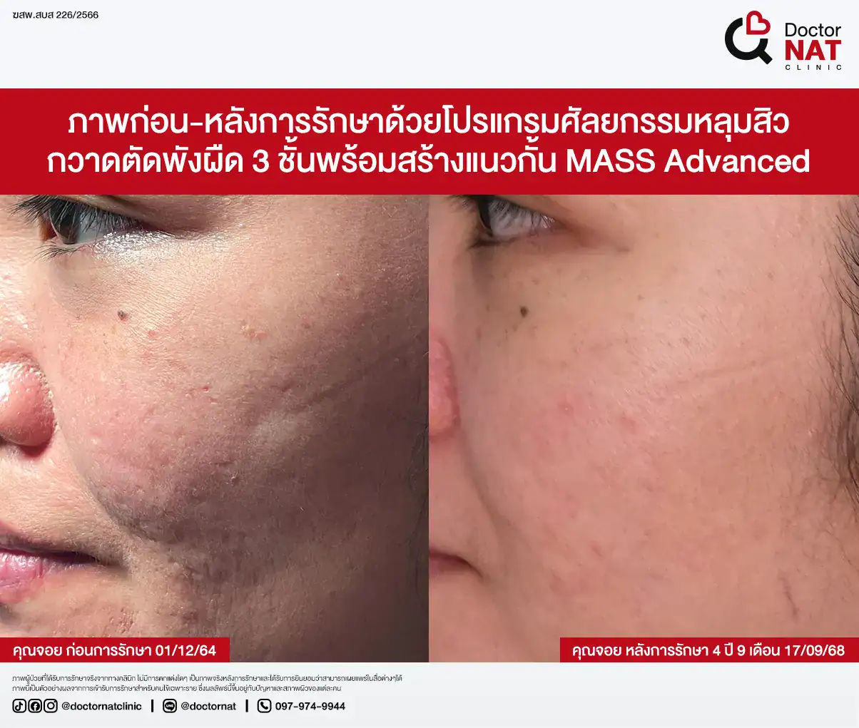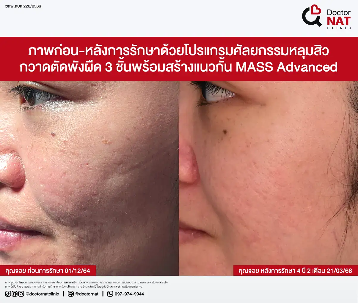 คุณป้อ พนักงานออฟฟิศที่กังวลเรื่องหลุมสิวมานานกว่า 20 ปี ผ่านการรักษามาหลายวิธี ทั้งแต้มกรด, Fraxel, Pico และ Microneedling ซึ่งดีขึ้นเพียงเล็กน้อยหรือแค่ช่วยเรื่องผิวโดยรวม จนผลลัพธ์ไม่ตรงจุดที่ต้องการ หลังเข้ามาทำโปรแกรม MASS ที่ Doctor NAT Clinic เพียง 1 ครั้ง หลุมสิวดีขึ้น 40–50% จนมีแต่คนทักว่าผิวดีขึ้น และไม่มีใครเรียกว่า “ไอ้หน้าหลุม” อีกแล้ว