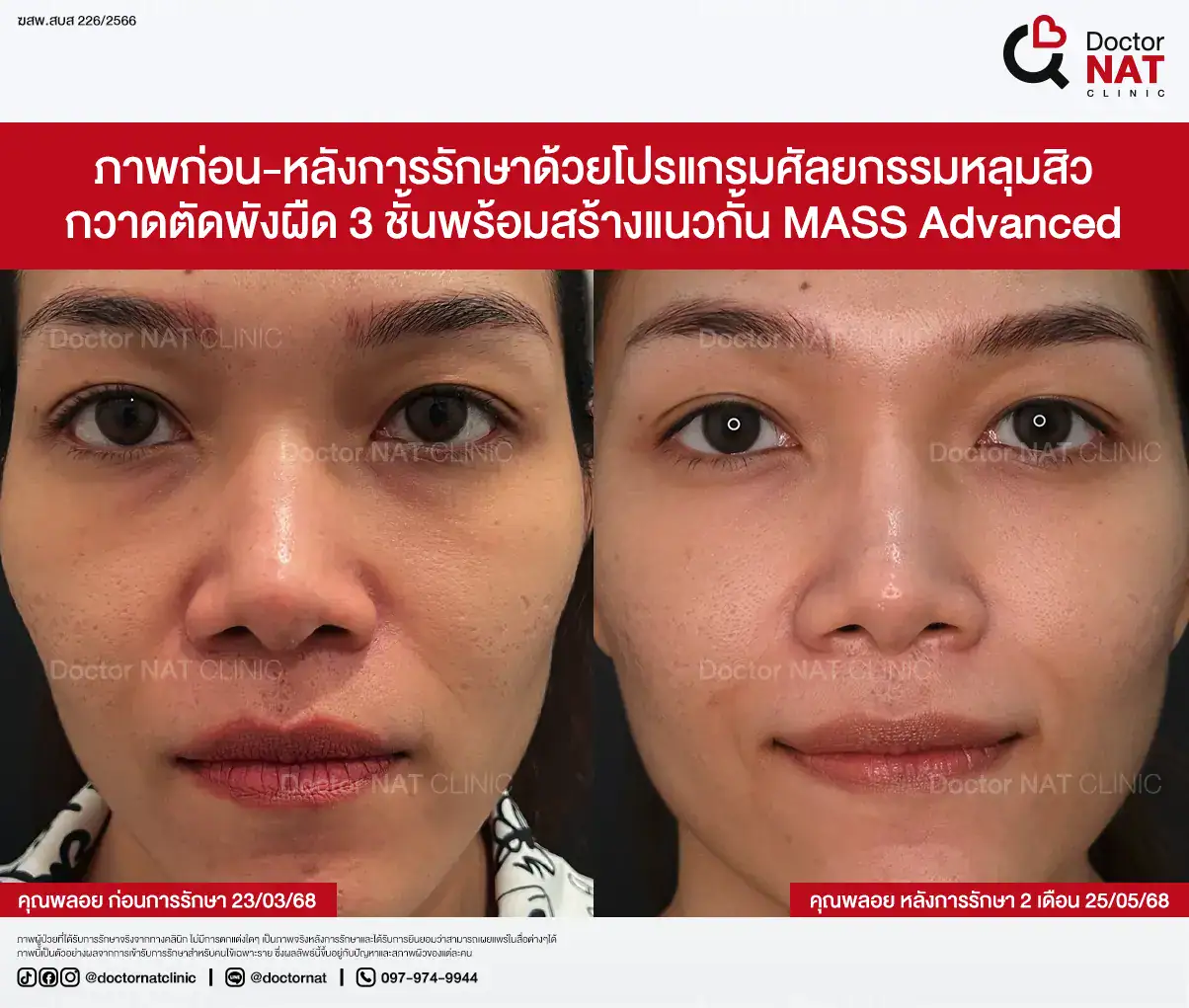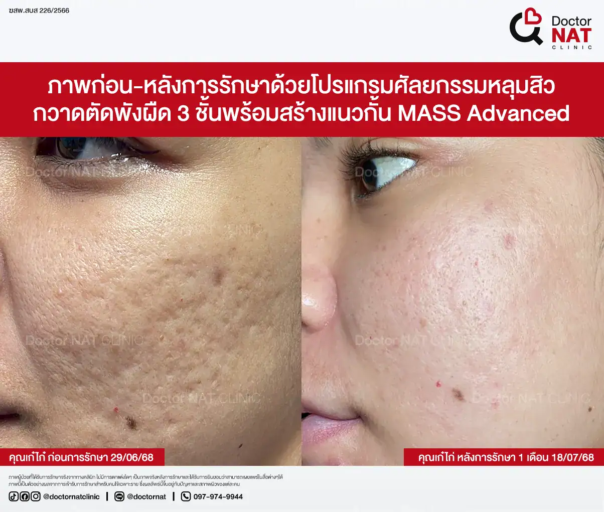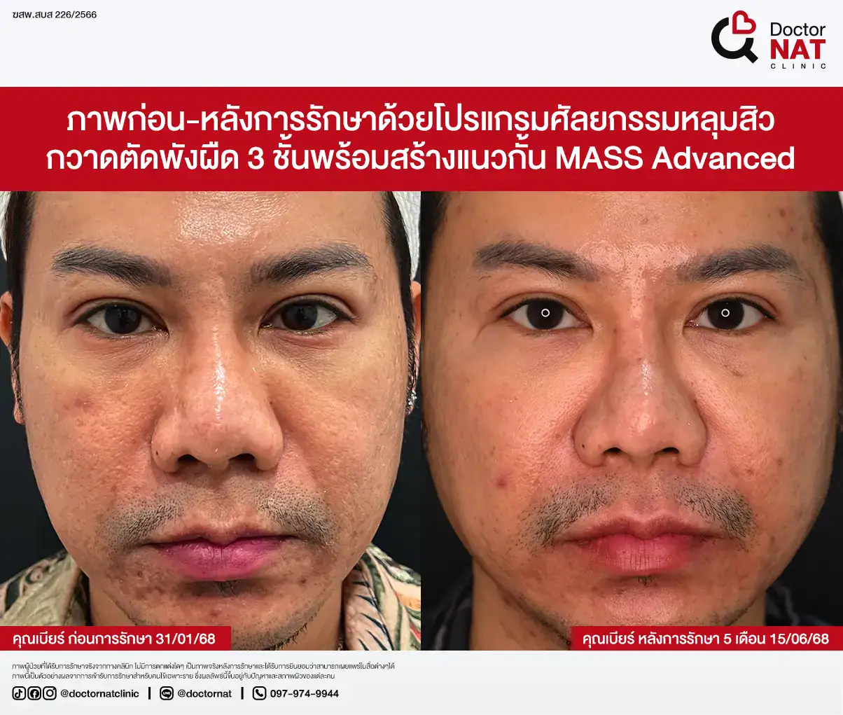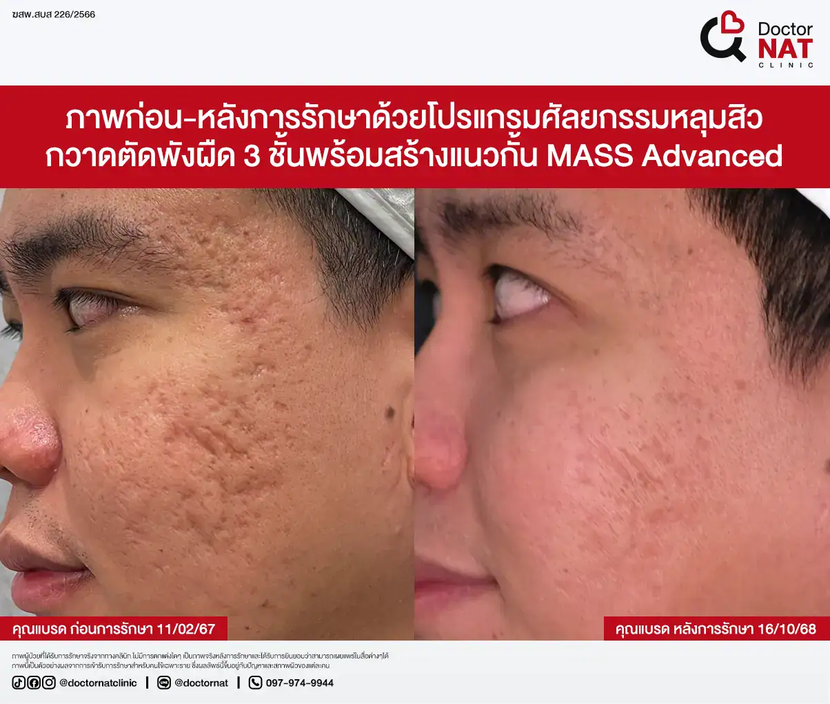 คุณป้อ พนักงานออฟฟิศที่กังวลเรื่องหลุมสิวมานานกว่า 20 ปี ผ่านการรักษามาหลายวิธี ทั้งแต้มกรด, Fraxel, Pico และ Microneedling ซึ่งดีขึ้นเพียงเล็กน้อยหรือแค่ช่วยเรื่องผิวโดยรวม จนผลลัพธ์ไม่ตรงจุดที่ต้องการ หลังเข้ามาทำโปรแกรม MASS ที่ Doctor NAT Clinic เพียง 1 ครั้ง หลุมสิวดีขึ้น 40–50% จนมีแต่คนทักว่าผิวดีขึ้น และไม่มีใครเรียกว่า “ไอ้หน้าหลุม” อีกแล้ว