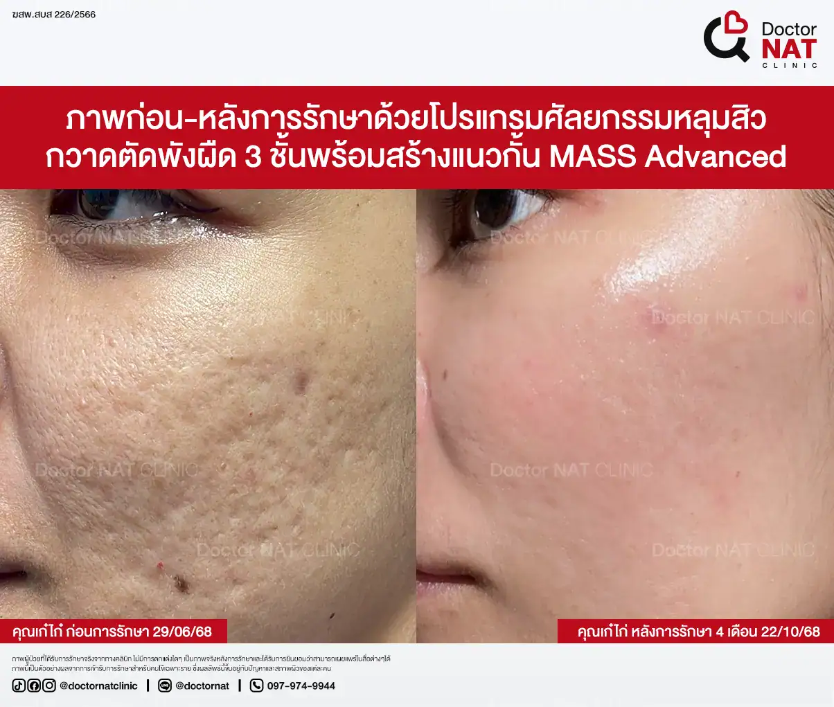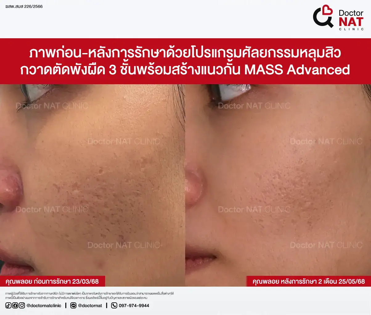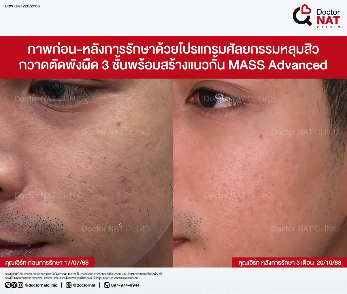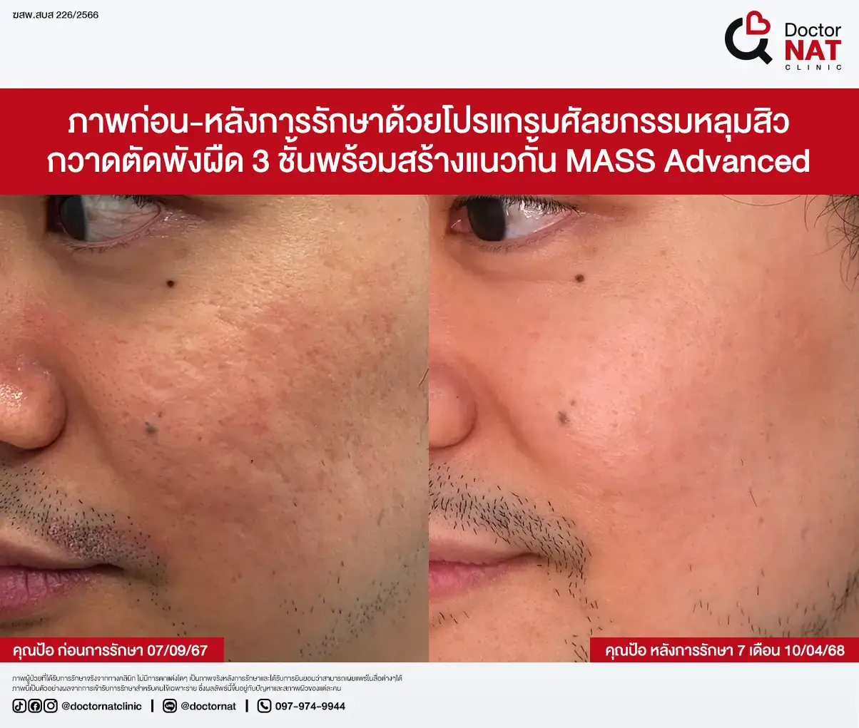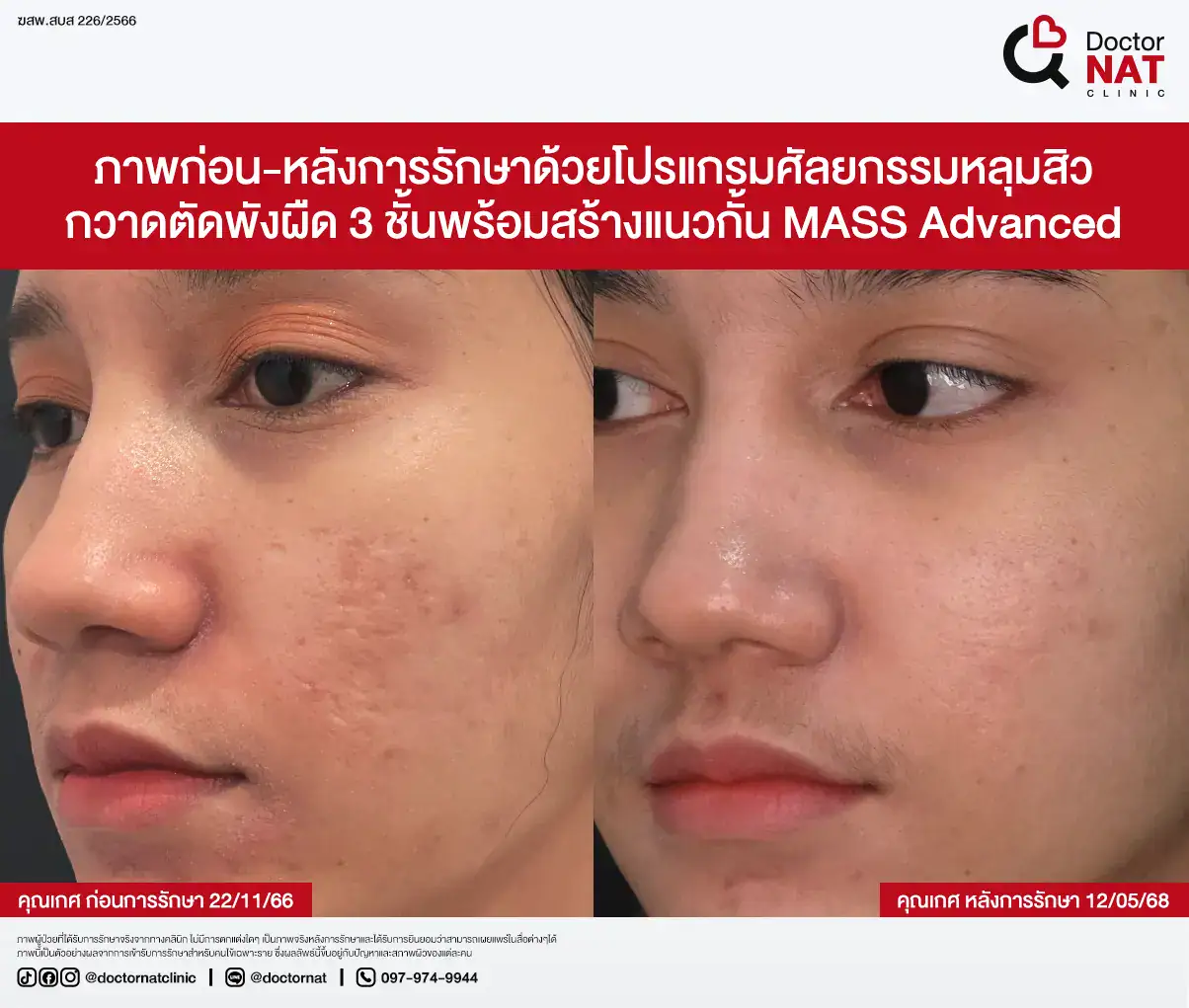 คุณป้อ พนักงานออฟฟิศที่กังวลเรื่องหลุมสิวมานานกว่า 20 ปี ผ่านการรักษามาหลายวิธี ทั้งแต้มกรด, Fraxel, Pico และ Microneedling ซึ่งดีขึ้นเพียงเล็กน้อยหรือแค่ช่วยเรื่องผิวโดยรวม จนผลลัพธ์ไม่ตรงจุดที่ต้องการ หลังเข้ามาทำโปรแกรม MASS ที่ Doctor NAT Clinic เพียง 1 ครั้ง หลุมสิวดีขึ้น 40–50% จนมีแต่คนทักว่าผิวดีขึ้น และไม่มีใครเรียกว่า “ไอ้หน้าหลุม” อีกแล้ว