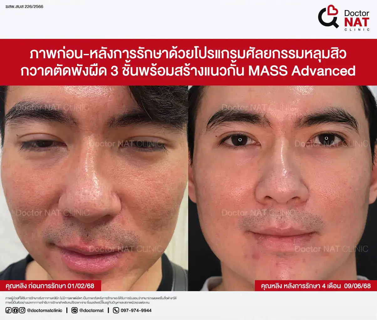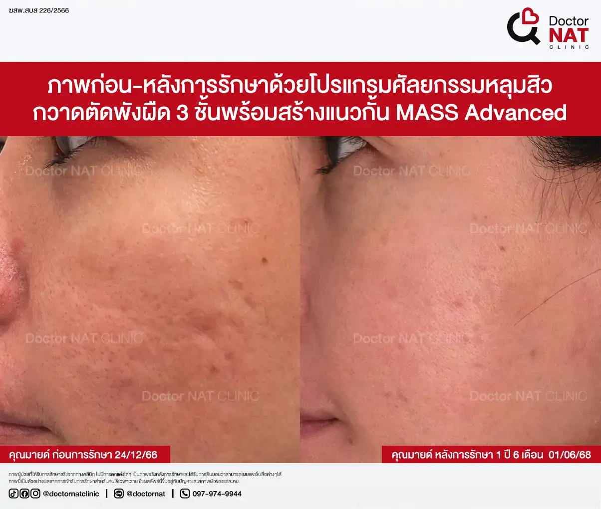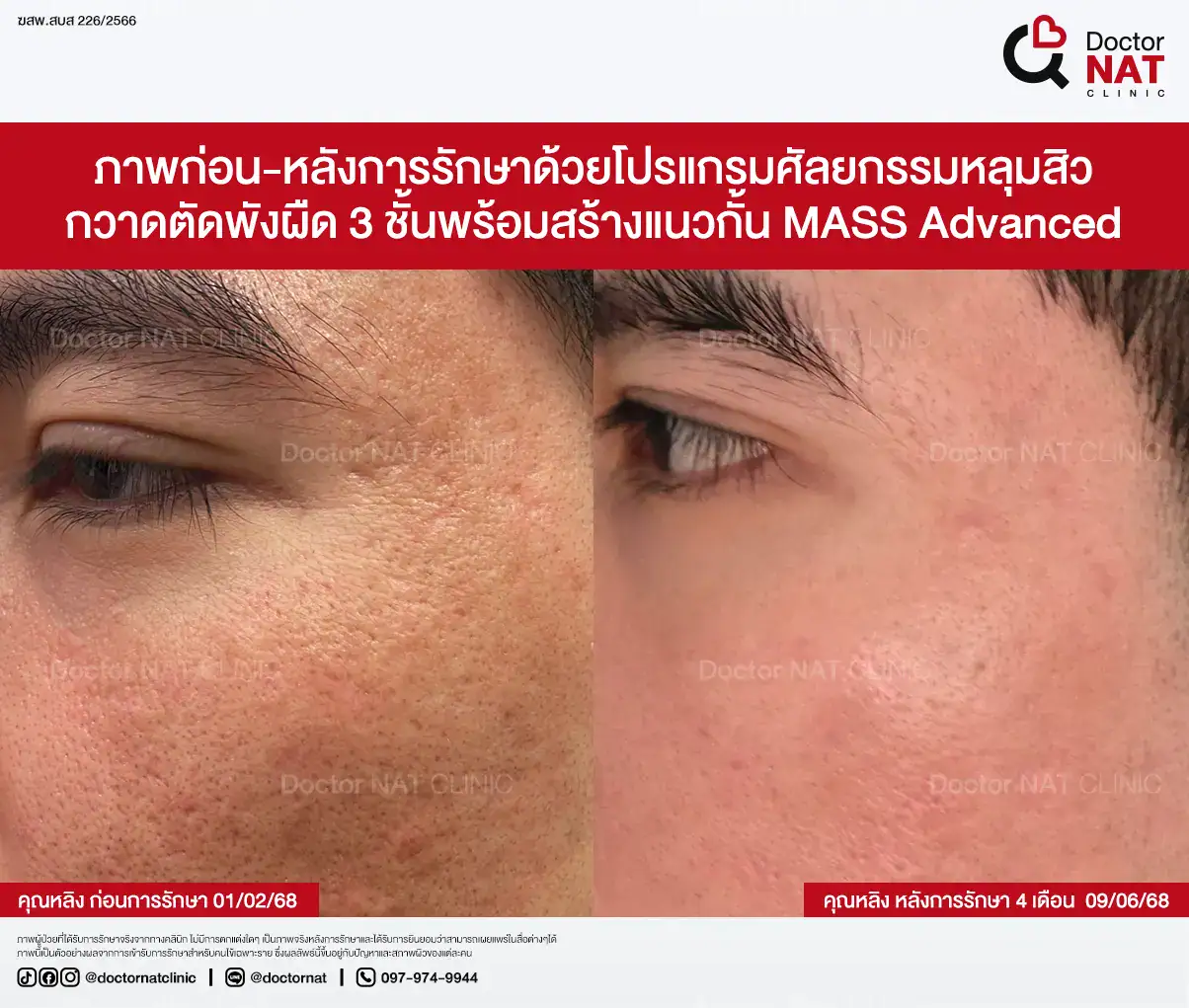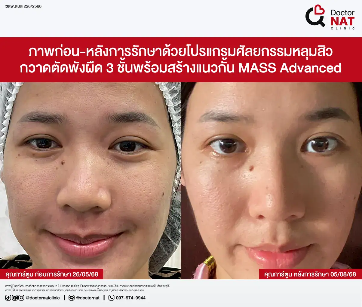 คุณป้อ พนักงานออฟฟิศที่กังวลเรื่องหลุมสิวมานานกว่า 20 ปี ผ่านการรักษามาหลายวิธี ทั้งแต้มกรด, Fraxel, Pico และ Microneedling ซึ่งดีขึ้นเพียงเล็กน้อยหรือแค่ช่วยเรื่องผิวโดยรวม จนผลลัพธ์ไม่ตรงจุดที่ต้องการ หลังเข้ามาทำโปรแกรม MASS ที่ Doctor NAT Clinic เพียง 1 ครั้ง หลุมสิวดีขึ้น 40–50% จนมีแต่คนทักว่าผิวดีขึ้น และไม่มีใครเรียกว่า “ไอ้หน้าหลุม” อีกแล้ว