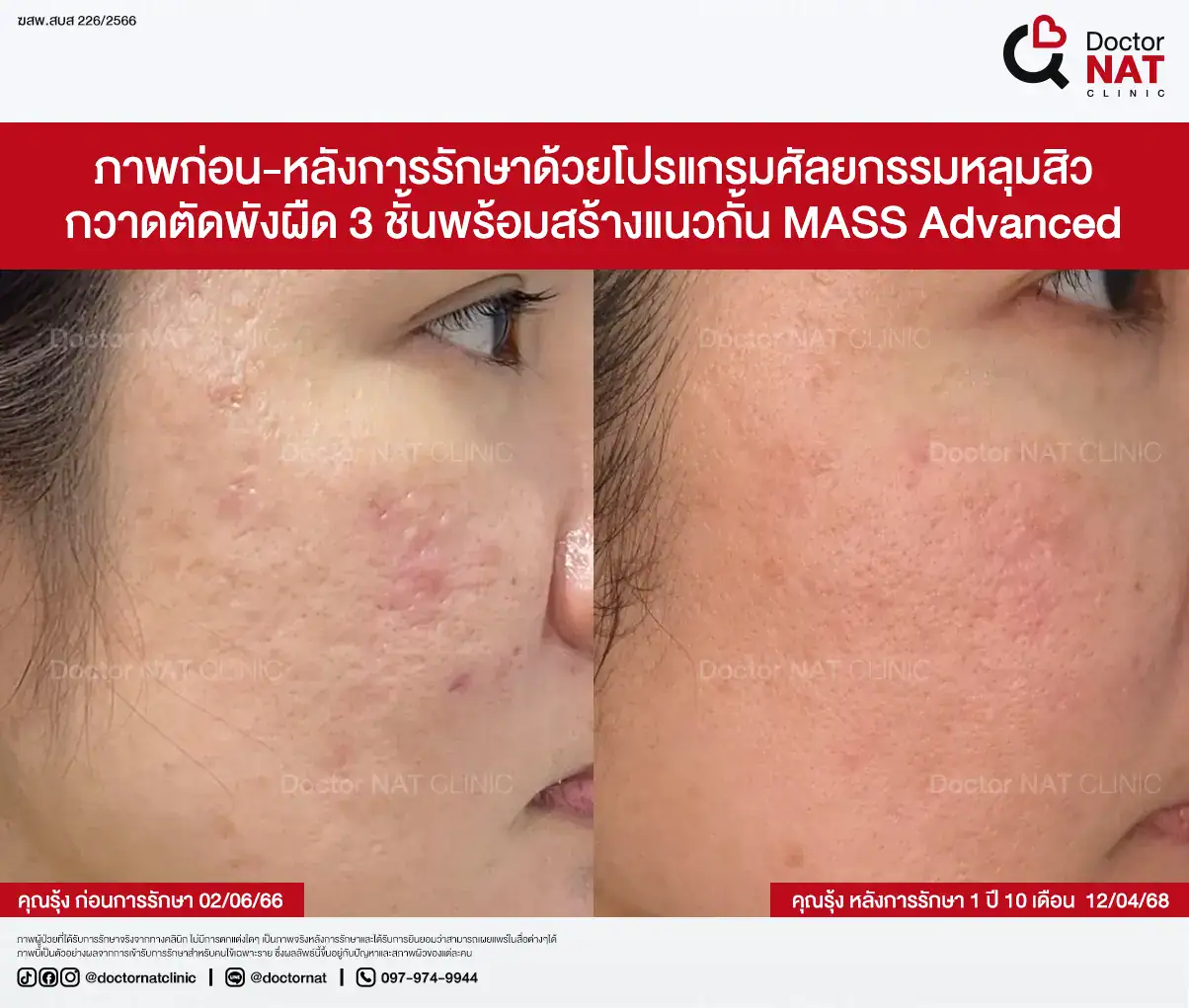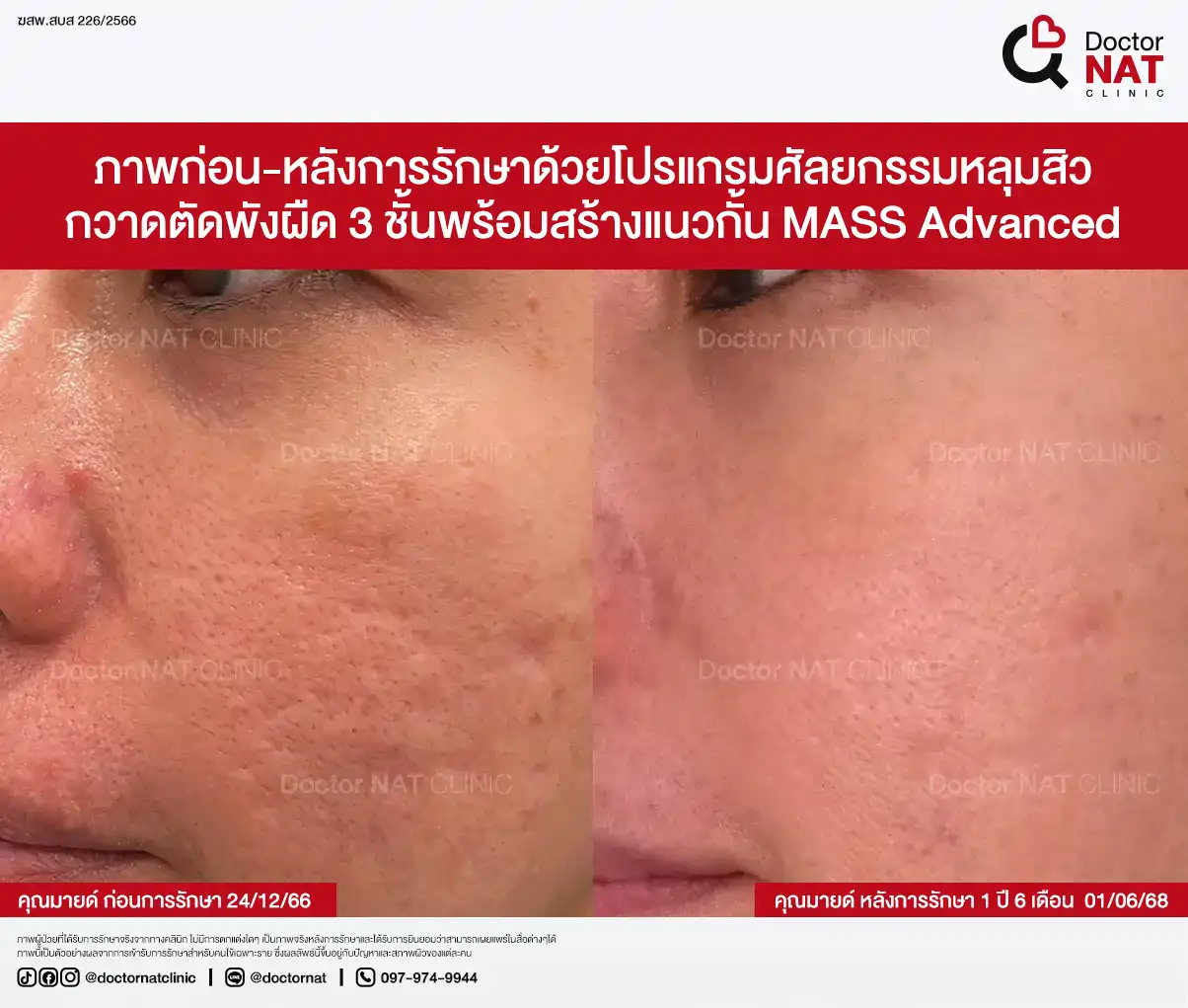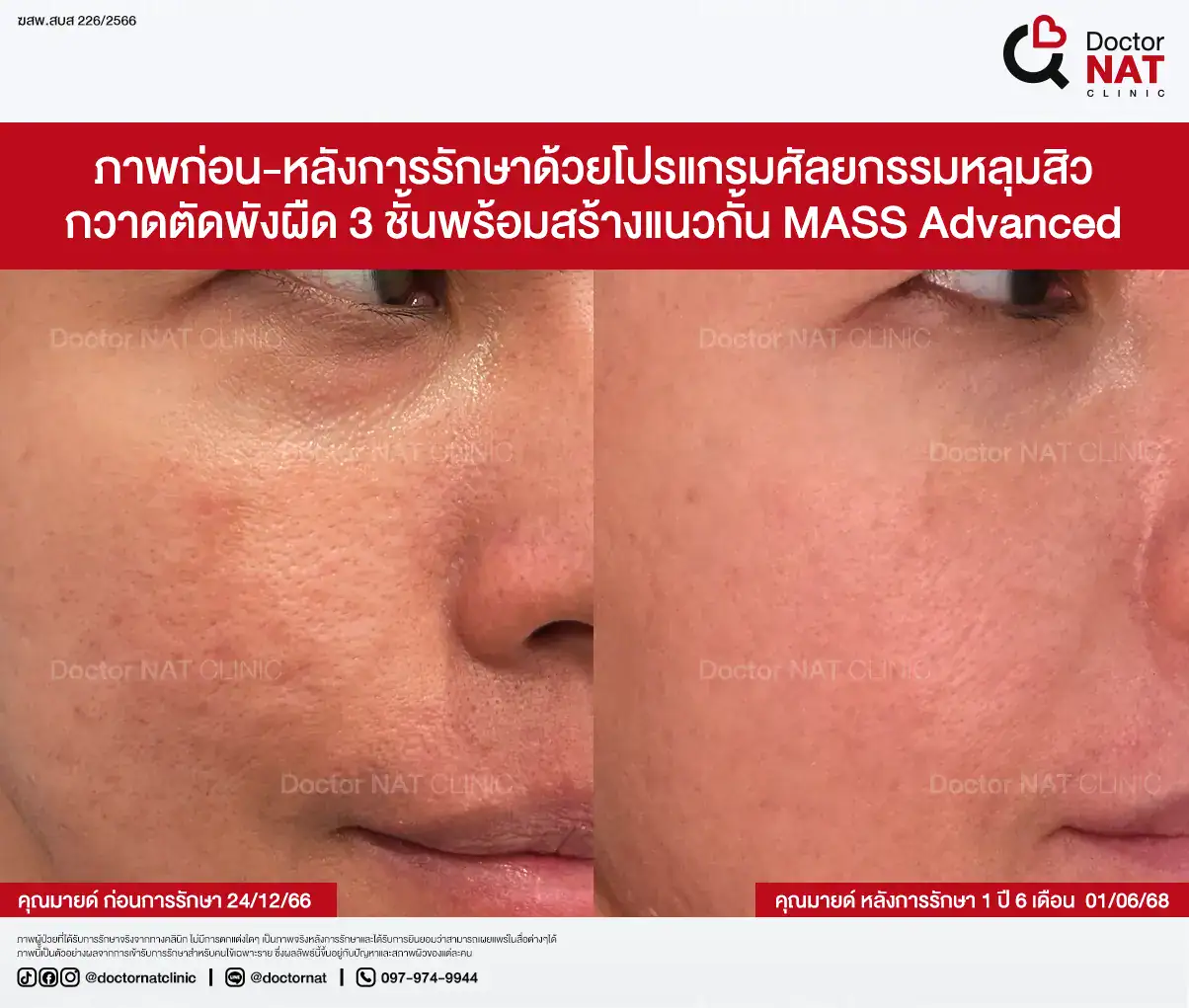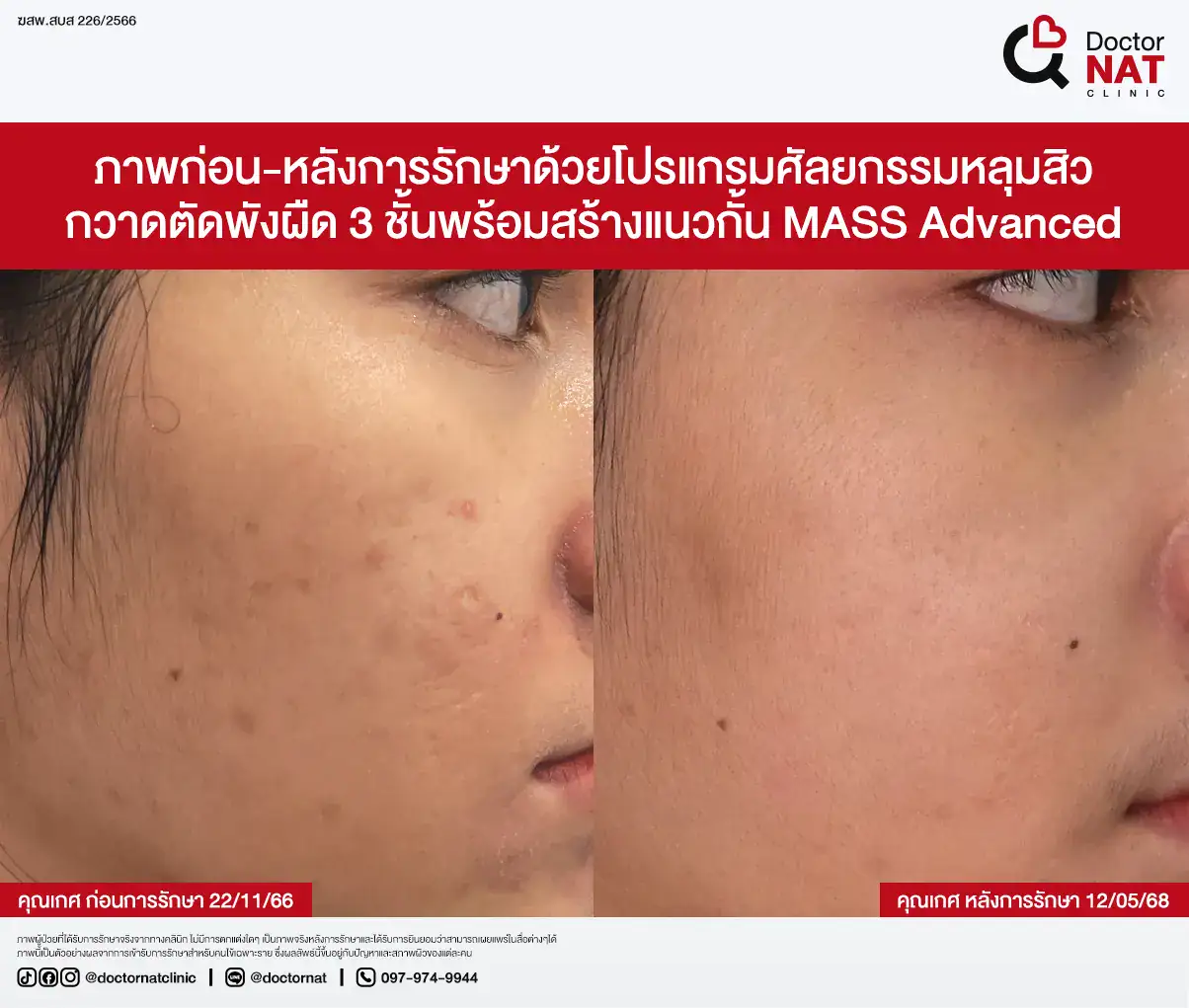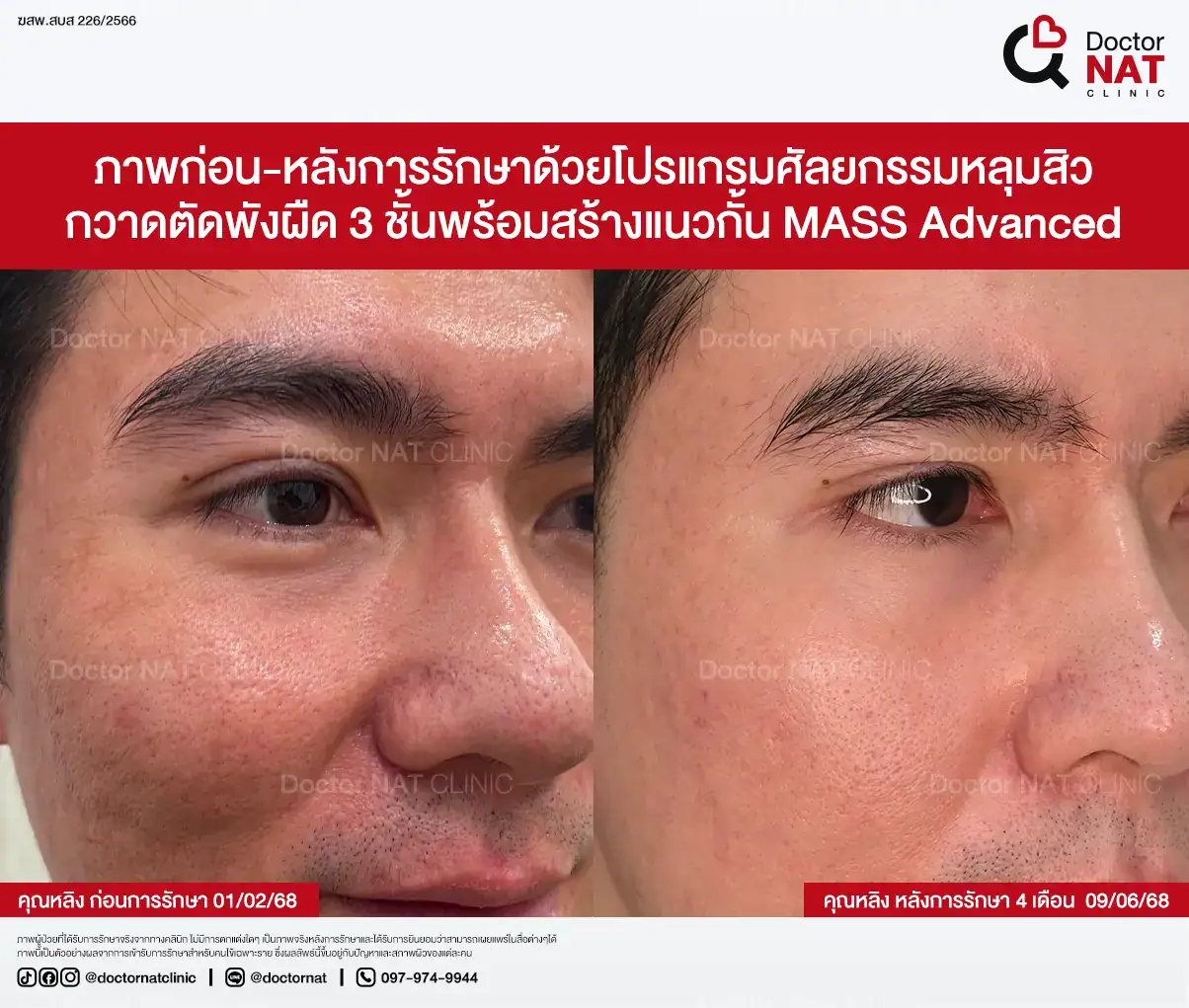 คุณป้อ พนักงานออฟฟิศที่กังวลเรื่องหลุมสิวมานานกว่า 20 ปี ผ่านการรักษามาหลายวิธี ทั้งแต้มกรด, Fraxel, Pico และ Microneedling ซึ่งดีขึ้นเพียงเล็กน้อยหรือแค่ช่วยเรื่องผิวโดยรวม จนผลลัพธ์ไม่ตรงจุดที่ต้องการ หลังเข้ามาทำโปรแกรม MASS ที่ Doctor NAT Clinic เพียง 1 ครั้ง หลุมสิวดีขึ้น 40–50% จนมีแต่คนทักว่าผิวดีขึ้น และไม่มีใครเรียกว่า “ไอ้หน้าหลุม” อีกแล้ว