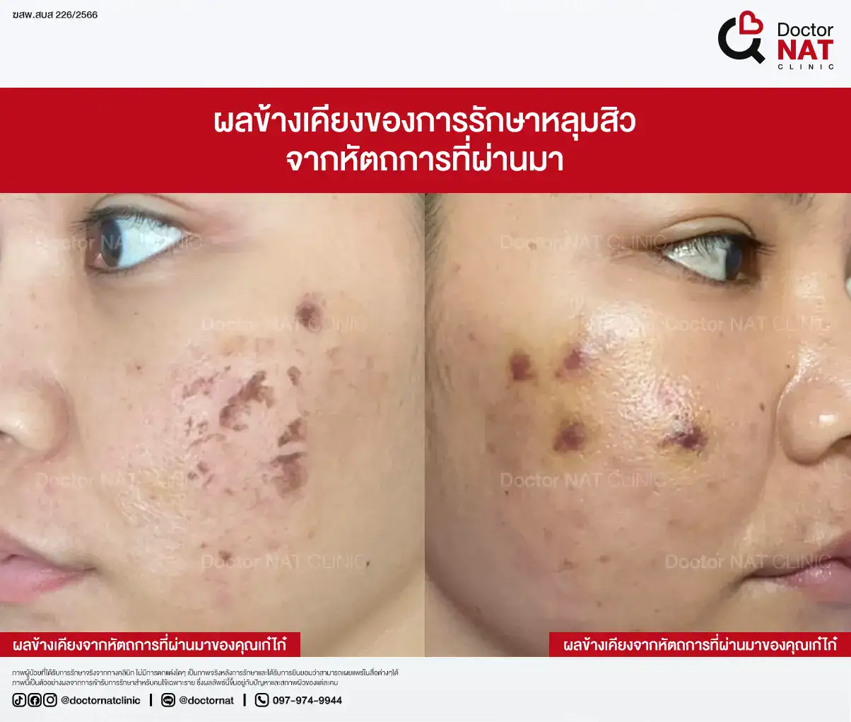 คุณรุ้ง พนักงานออฟฟิศจากสมุทรปราการ มีปัญหาหลุมสิวบริเวณแก้มและขมับยาวนานกว่า 10 ปี เคยรักษามาหลายวิธีทั้ง E-Matrix, Subcision, PRP และ Derma Pen รวมหลายสิบครั้ง ใช้งบไปหลักแสน แต่ได้ผลเพียงเล็กน้อย แถมต้องเผชิญกับอาการเจ็บ ช้ำ และสิวอักเสบตามมา จนมารักษาด้วยโปรแกรม MASS Surgery ที่ Doctor NAT Clinic หลุมสิวของคุณรุ้งดีขึ้นชัดเจน 60–70% มากกว่าการรักษาที่เคยทำมาทั้งหมด